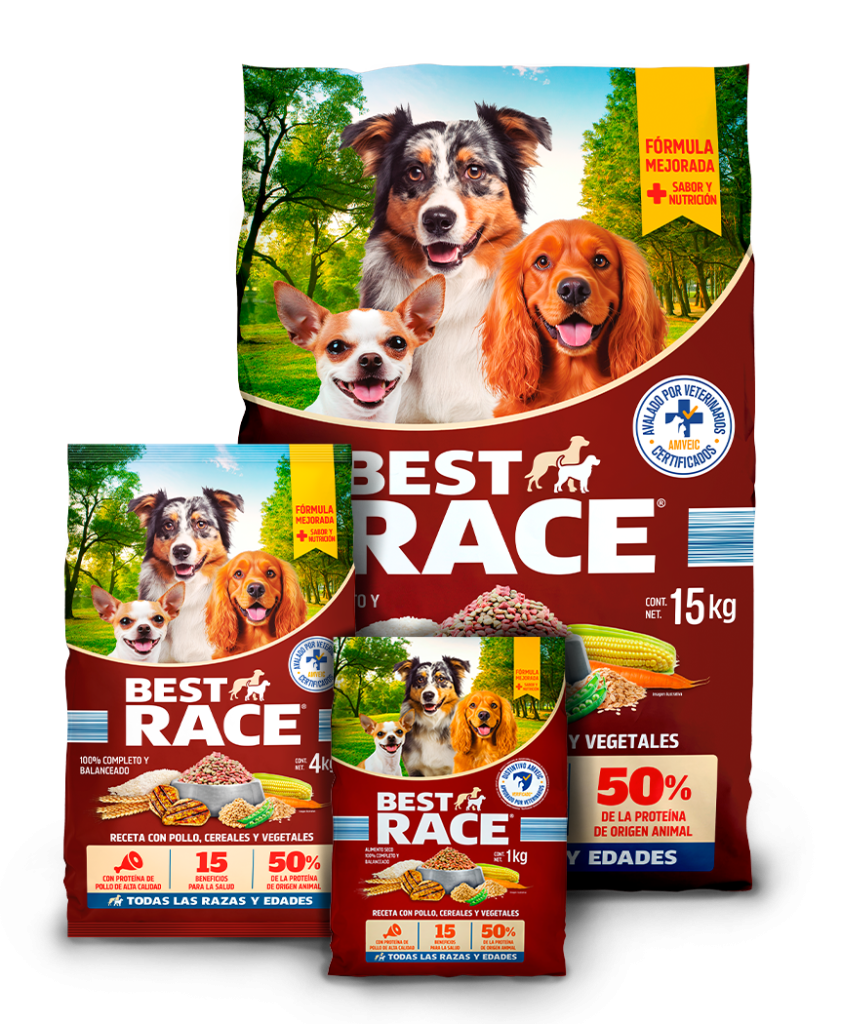 Best Race ahora cuenta con una fórmula enriquecida que ofrece una nutrición completa y balanceada, elaborada con ingredien tes seleccionados como pollo, cereales y vegetales, logrando una combinación ideal entre sabor y beneficios para la salud.