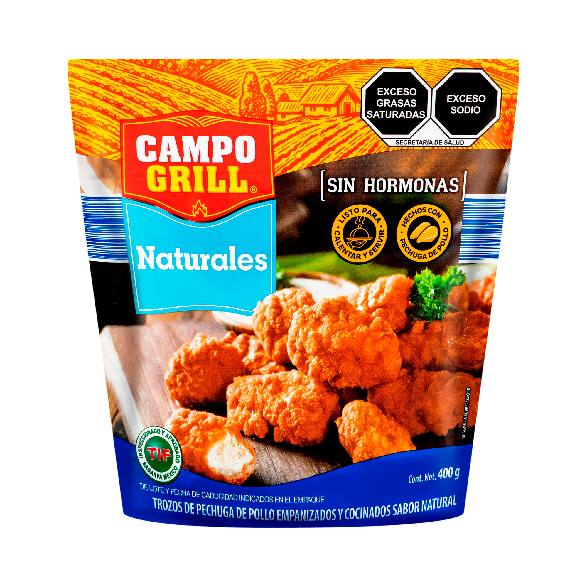 Los Boneless Naturales Campo Grill están hechos con trozos de pechuga de pollo empanizados y cocinados con sabor natural, perfectos para comidas rápidas, reuniones o como botana. Solo necesitas calentarlos para disfrutarlos. Su elaboración con pechuga de pollo y su fórmula sin hormonas ofrecen una opción confiable y versátil. Con 400 g por bolsa, obtienes calidad y una porción ideal para compartir o preparar tus platillos favoritos.