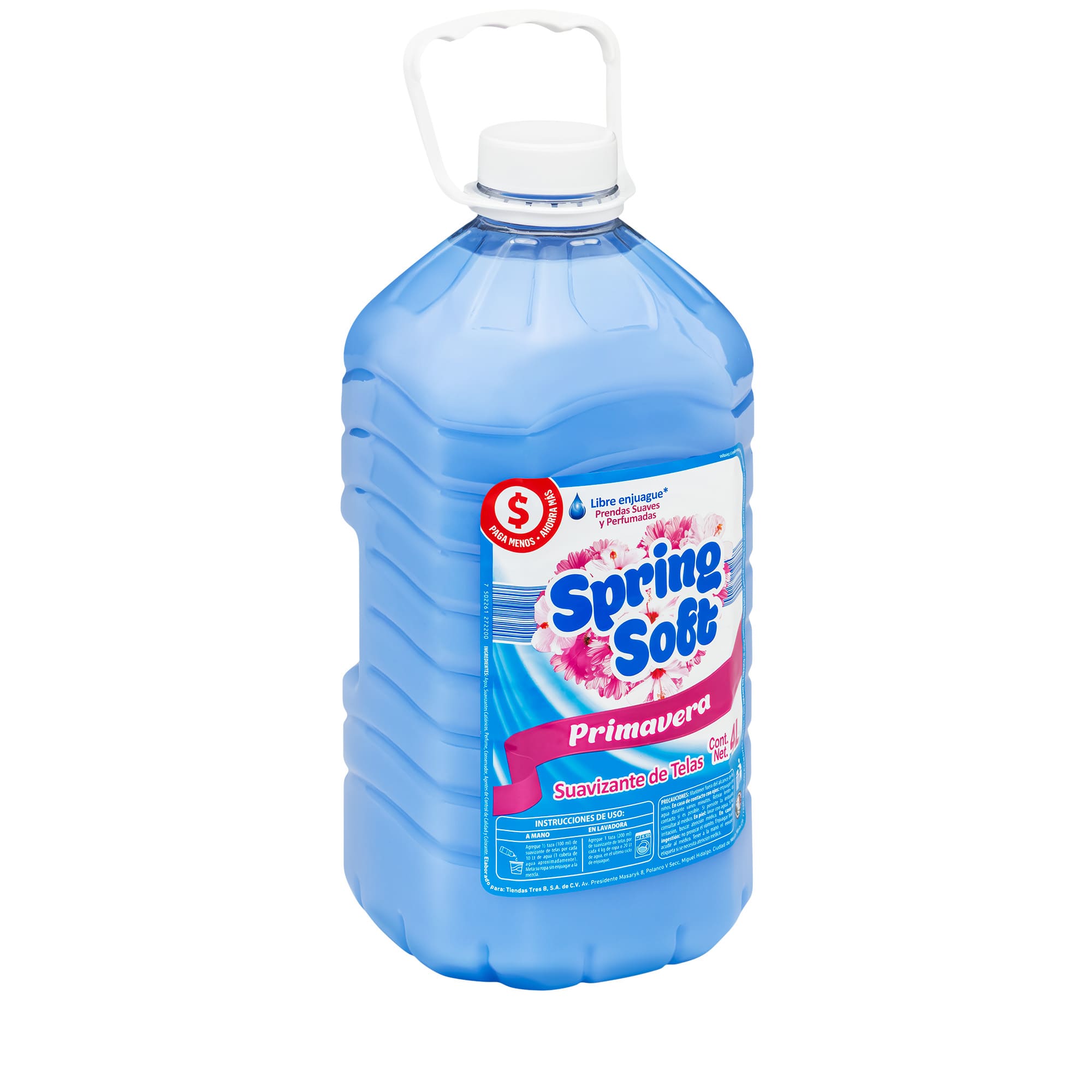 Suavizante de telas fresca primavera Soft 4L, libre enjuague. Prendas suaves y perfumadas.