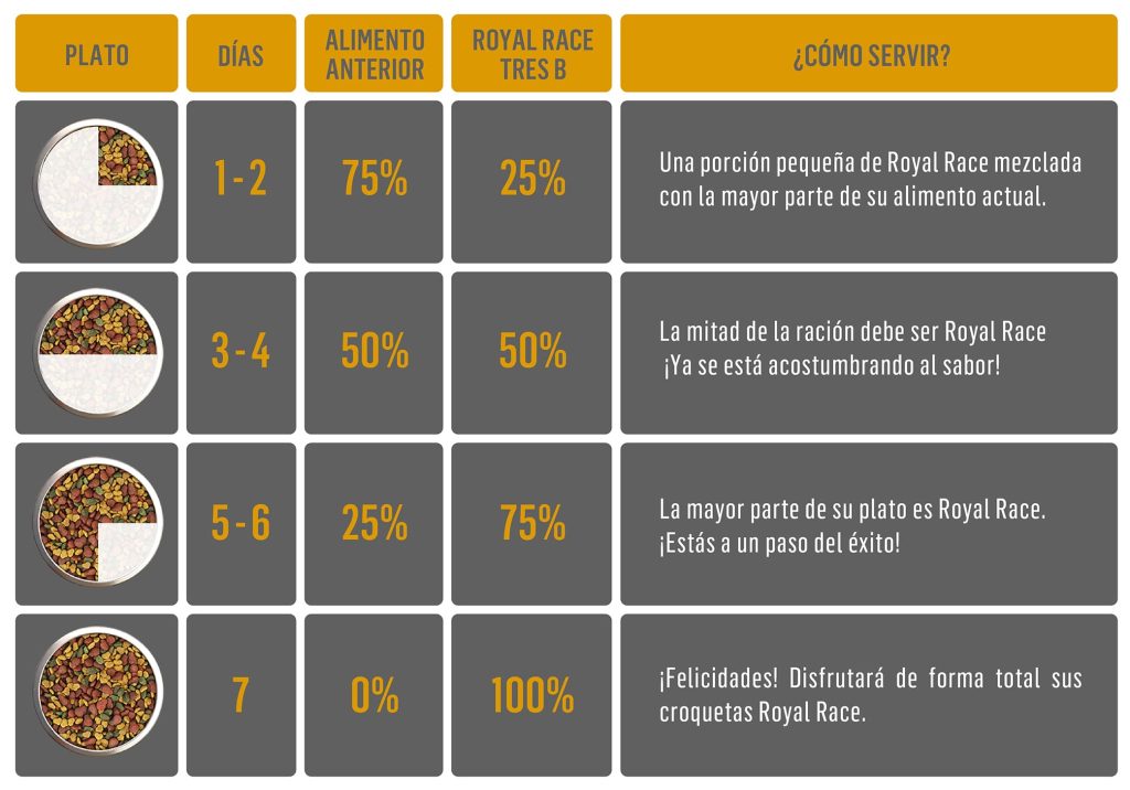 Al introducir Royal Race gradualmente, le damos tiempo a su flora intestinal para adaptarse a los nuevos ingredientes. Esto evita molestias como diarrea, gases o el simple rechazo del alimento.